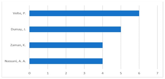 The 10 most ‘prolific’ authors—in terms of publication numbers—in accounting for ESG dynamics and disruptive events. Note: The 10th place belongs to (in alphabetical order) to: Abed, Abro, Al-Najjar, Anser, Aureli, Bollas-Araya, Branco, Craig, Elmarzouk, Manzaneque-Lizano and Polo-Garrido (with three publications each).