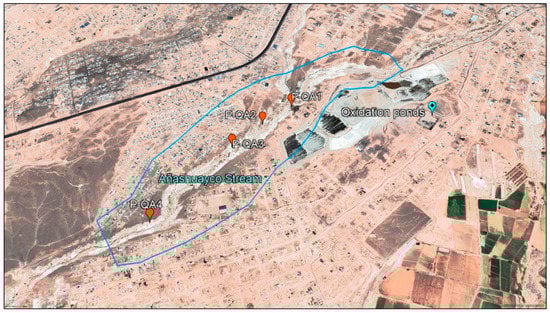 Geographic location of the studied area in the Quebrada de Añashuayco. The sampling points are red-marked, and the oxidation ponds are the blue points. The studied area is bordered by a blue line.