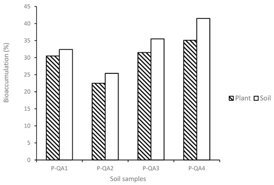 The Peruvian national standard was used to calculate the phytoremediation efficiency, as the study was evaluated on Peru (Figure 1 and Table 1). The values obtained were compared with the National Quality Standards (ECA). Although when compared with other international values such as the Canadian Soil Quality Guidelines and Environmental Protection Agency (EPA) Soil Quality Guidelines, they also exceed the values for residential soil of 64 (mg/kg) and 230 (mg/kg), respectively, and for industrial soil of 87 (mg/kg) and 510 (mg/kg), respectively [48]. In both cases, both the initial values exceed these values, while in the final values only the residential values exceed them; additionally, the industrial values for the Environmental Protection Agency (EPA) Soil Quality Guidelines both in point P-QA1 and P-QA2 do not exceed them, remaining below them.