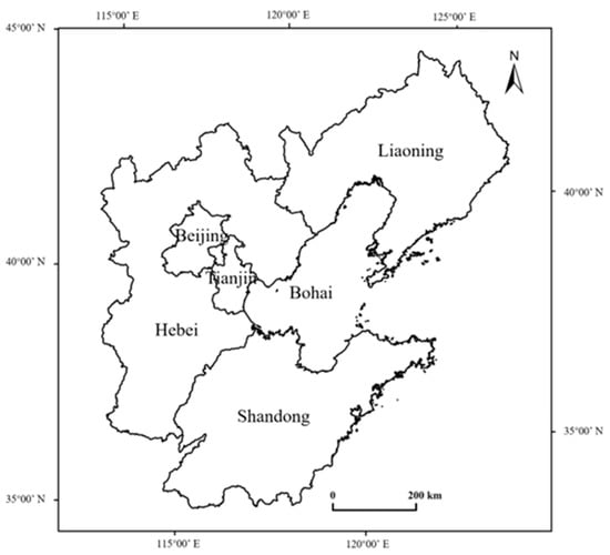 The politically significant Bohai Rim region includes seven provinces and cities, including Beijing and Tianjin, as well as Hebei Province, Liaoning Province, Shandong Province, Shanxi Province, and the central region of Inner Mongolia. The geographical significance of the Bohai Rim region includes three provinces and cities directly connected to the Bohai Sea, including Beijing, Tianjin, Hebei, Shandong, and Liaoning provinces. This study used the geographical significance of the Bohai Rim region, including three provinces (Liaoning, Hebei, and Shandong) and two cities (Tianjin and Beijing), covering an area of approximately 1,280,000 km2. The map of the Bohai Rim is shown in Figure 1.