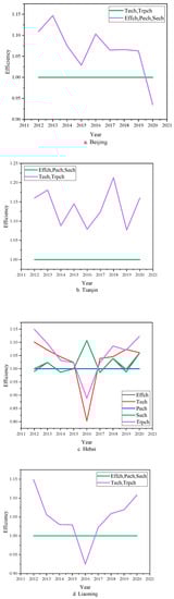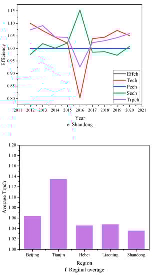 The agricultural productivity of Beijing during 2011–2020 is one, which is relatively stable. The Effch, Tech, and Sech are all greater than one in 2011–2019 but less than one in 2020. The overall agricultural productivity of Tianjin is greater than one, with slight fluctuations. The Effch, Pech, and Sech are relatively stable from 2011 to 2020, with an efficiency value of one. The agricultural productivity of Hebei Province is less than one in 2016, and the Trpch is greater than one in other years during the research period. The variation in Trpch in Liaoning Province and Shandong Province is similar to that in Hebei Province. The agricultural productivity is less than one in 2016, while that in other years is greater than one. It might be caused by the widespread natural disasters in China in 2016, affecting 8531.4 hectares of crops and leading to the loss of 1297.3 hectares. In addition, extreme and severe convective weather frequently occurred in 2016, and the affected area of crops was 2.908 million hectares, of which 268.8 thousand hectares were lost. Therefore, agricultural technology should be enhanced to improve the protection ability and reduce agricultural disasters under extreme weather conditions.