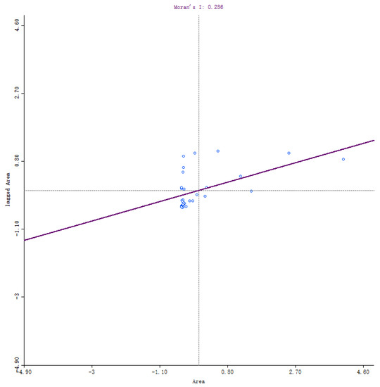 Moran scatterplot with the spatial autocorrelation trendline obtained for the idle land area at the town level.