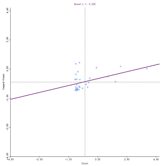 Moran scatterplot with the spatial autocorrelation trendline obtained for the idle land quantity at the town level.