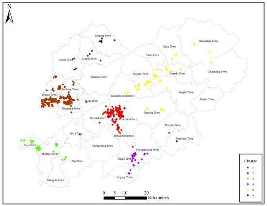 Let and ; then, Equation (10) is used to identify the spatial pattern of idle land in Liuyang City. The spatial clustering results are shown in Figure 14 and illustrate the existence of six spatial clusters. According to the diagram, cluster 1 includes Yong’an, Beisheng, and Dongyang; Cluster 2 includes Jili, Guankou, Huaichuan, and Hehua; Cluster 3 includes Baijia and Zhentou; Cluster 4 includes Dayao, Chengtan River, and Jingang; cluster 5 includes Gugang, Yanxi, and Guandu; and cluster 6 includes Longfu and Shegang. The diagram also shows that most idle land areas in Liuyang belong to one of 2 clusters: clusters 1 and 2.