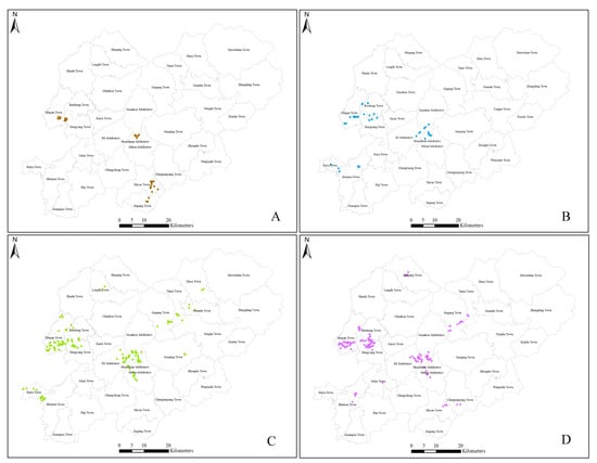Diagram of the spatial-semantic clustering results (A–D) of idle land in Liuyang.