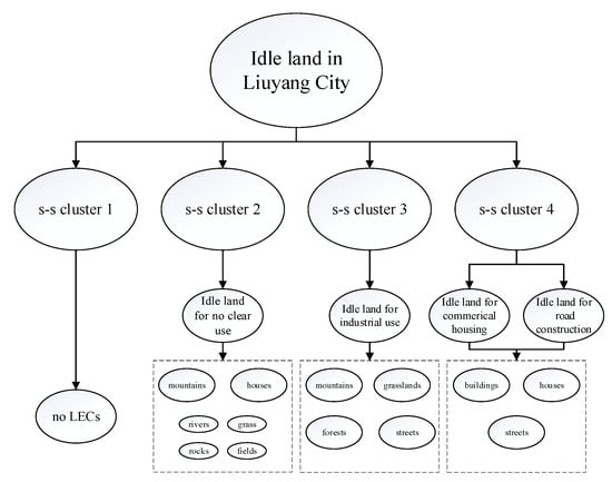 The results of the spatial-semantic clustering analysis indicate that the spatial clusters are associated with clusters that have different LECs, which may help to infer the type of idle land in each cluster. Spatial cluster 1 and spatial cluster 2, which are dominant among the six spatial clusters, are mainly associated with idle land intended for industrial use, commercial housing, and road construction. The remaining spatial clusters did not exhibit a dominant type of idle land but rather showed a random combination of idle land use types.