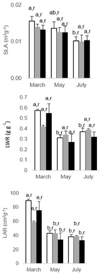 Alterations regarding the leaf traits, specific leaf area (SLA), leaf weight ratio (LWR), and leaf area ratio (LAR), in Eucalyptus nitens, along the experimental For each parameter, different letters after the mean values ± standard error (n = 4) express significant differences over time (a, b) or between As treatments within each date (r), considering the control (white), 100 As (grey), and 200 As (black) treatments, and the data points T1(March), T2 (May), and T3 (July).