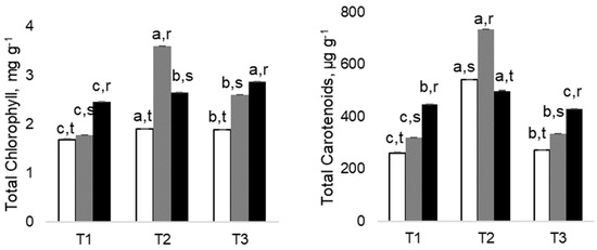 Changes in Total Chlorophyll and Total Carotenoids in Eucalyptus nitens, along the experimental. Different letters after the mean values ± standard error (n = 4) express significant differences over time (a, b, c) or between As treatments within each date (r, s, t), considering the control (white), 100 As (grey), and 200 As (black) treatments, and the data points T1(March), T2 (May) and T3 (July).