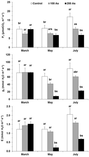 The As impact was mostly absent by the first date of evaluation in Pn, gs, and E (Figure 3). However, with the persistence of As submission in time, significant impacts were observed in May and July for the three parameters, as compared with their respective controls. The impacts were also dose-related, with the greatest reductions observed with un the 200 As plants and with 100 As counterparts showing an intermediate decline. Therefore, maximal differences to the control values were observed in the latest evaluation date (July) when 200 As showed declines of 60%, 72%, and 67% for Pn, gs, and E, respectively.