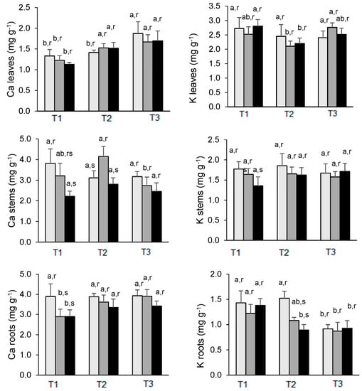 Changes in Ca (left) and K (right) concentration in the leaves, stems, and roots of E. nitens along the experiment. Mean values are expressed as mg g−1 ± standard deviation. For each element, different letters indicate significant differences at the 0.05 significance level over time (a, b) or between As treatments within each date (r, s). T1 = March; T2 = May; T3 = July: