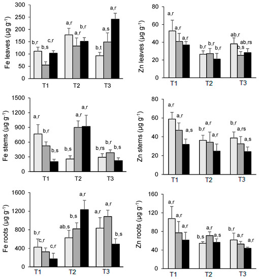 Changes in Fe (left) and Zn (right) concentration in the leaves, stems, and roots of E. nitens along the experiment. Mean values are expressed as mg g−1 ± standard deviation. For each element, different letters indicate significant differences at the 0.05 significance level over time (a, b, c) or between As treatments within each date (r, s). T1 = March; T2 = May; T3 = July: