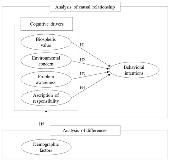 Table 6 presents the results of the t-tests and the ANOVA, which were conducted in order to test the hypothesis of the differences in the cognitive drivers, which were based on demographic factors. A p-value that was less than 0.1 was used as the cutoff for significance in the present study, which was based on extant studies [55,59,60,61]. The results of the t-tests showed that there were significant differences in environmental concern (t = −2.284 and p < 0.05) and problem awareness (t = −2.880 and p < 0.01) based on gender. It indicated that females had higher environmental concern and problem awareness than males did. The results of the ANOVA showed that there were significant differences in biospheric value based on age (F = 2.862 and p < 0.05) and marital status (F = 2.578 and p < 0.1). The post hoc tests indicated that individuals in their 20s had higher biospheric value than individuals in their 30s and individuals in their 50s or older. Additionally, married individuals had higher biospheric value than single individuals. However, the differences in ascribed responsibility based on demographic factors were found to be insignificant. Therefore, H5 was only partially supported.