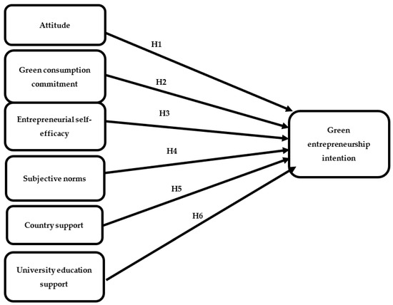 The third external factor is subjective norms. Subjective norms are known as individuals’ beliefs about what other people expect them to do or not do in a given situation. These are the perceived social pressures that influence an individual’s choice to take part in a certain activity or not [20]. Early exposure to challenging business conditions is expected to increase individual autonomy and positive attitudes towards self-employment [39]. According to [41], one of the factors driving personal business aspirations are subjective norms that influence students’ entrepreneurship intentions. Moreover, empirical research results find that subjective norms are a good predictor of entrepreneurial intentions [17,42]. More specifically, [20] reported a positive impact for subjective norms on green entrepreneurship. It was found that individuals who faced more social pressure to start a green business were more likely to have green entrepreneurship intentions [40,43]. This suggests that the opinions and beliefs of important close personalities, such as family, friends, and business associates, can influence a person’s intentions to start a green business. Based on the above discussion, the following hypotheses can be formulated: