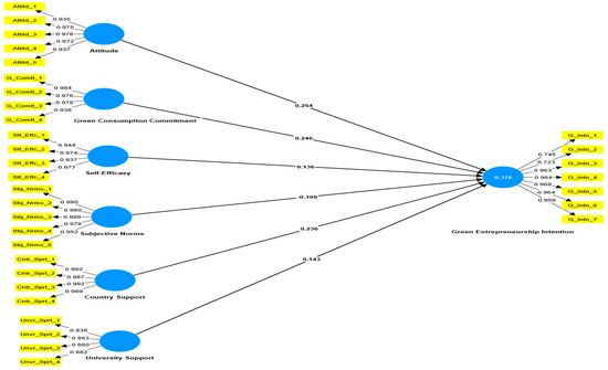 The above results indicate that the connection with internal antecedents of green entrepreneurship intentions is stronger than that of external antecedents of green entrepreneurship intentions. Green consumption commitment, self-efficacy, and attitude towards green entrepreneurship are more strongly associated with entrepreneurship intentions than external factors such as subjective norms, university, and country support. This implies that, while access to funding and resources can be a significant factor in enabling entrepreneurship, it may not be as critical as an individual’s personality or inherited attitudes in driving their decision to become an entrepreneur. Therefore, policymakers and educators who aim to promote entrepreneurship should focus on developing and nurturing these internal antecedents in individuals, rather than relying solely on external factors to drive entrepreneurship intentions.
