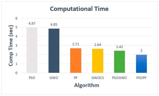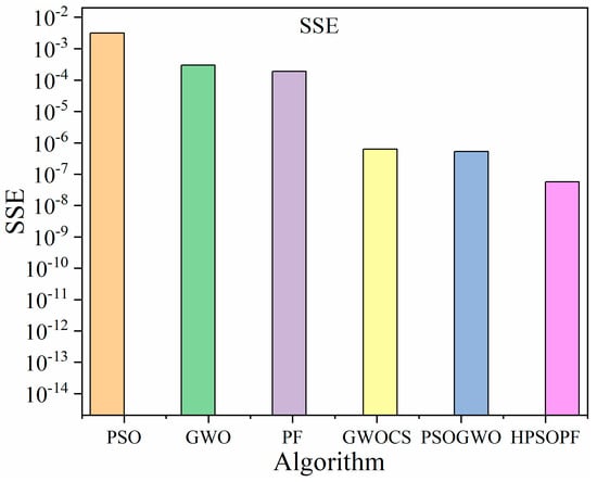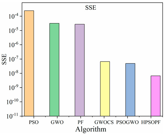 The values of the objective function, computational time (s), and SSE were calculated after the PEMFC parameter estimation, as represented in Table 5 and Table 6. Bar graphs corresponding to the SSE value and computational time (s) are shown in Figure 3 and Figure 4, respectively, for the Ballard Mark V model. Bar graphs corresponding to the SSE value and computational time (s) are shown in Figure 5 and Figure 6, respectively, of the Avista SR-12 model. It is very clear from the bar graphs that the SSE value and computational time (s) of both the models were the lowest in the case of the new proposed hybrid algorithm. The proposed algorithm is an efficient and better algorithm than other well-known meta-heuristic algorithms such as PSO, PF, GWO, GWOCS, and PSOGWO, for estimating the PEMFC parameters.