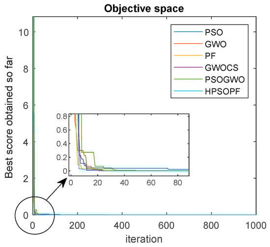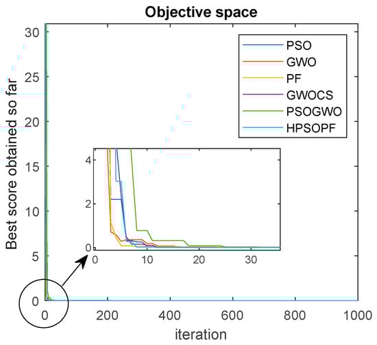 Ten benchmark test functions were selected, as shown in Table 1, for evaluation of the proposed hybrid algorithm, i.e., HPSOPF, for the PEMFC parameter estimation. The ten benchmark test functions contained seven uni-modal functions and three multi-modal functions where every function’s dimension was set to 30. Table 2 represents the values of the mean and standard deviation (SD) calculated using 10 benchmark test functions, and it was clear that the proposed hybrid algorithm, i.e., HPSOPF, had a remarkably better performance than the various other meta-heuristic algorithms, i.e., PSO, PF, and GWO, and hybrid algorithms, i.e., GWOCS and PSOGWO. The coding of each program was done in MATLAB 2020a in Windows 10 with 8 GB RAM and a 2.50 GHz intel CPU processor. The feature evaluation limit for the benchmark test functions comparison was 1000 and the code of every algorithm was run 20 times with dim size 30.