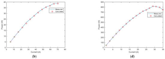 V−I and P−I curves for the Ballard Mark V model and for the Avista SR-12 model. (a) V−I curve for the Ballard Mark V model. (b) P−I curve for the Ballard Mark V model. (c) V−I curve for the Avista SR-12 Model. (d) P−I curve for the Avista SR-12 model.