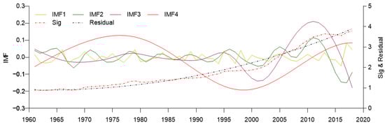 In the EEMD sieving process, the ratio between the added noise’s standard deviation and the signal’s standard deviation to be decomposed was 0.2, the average number of times for the signal was 100, and the number of IMFs are limited to log2N, where N is the number of years. In the sieving process, IMFs were sequentially extracted from high frequency to low frequency, which generated four IMFs and one residual (Figure 2).