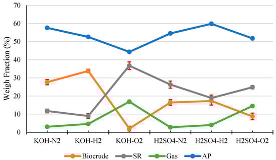 Figure 1 shows the products distribution in HTL of pinewood sawdust under N2, H2, and O2, respectively, with KOH or H2SO4 catalyst. As clearly shown in the Figure, reaction atmosphere and catalyst both have significant influence on the products distribution in HTL of the woody biomass. In terms of biocrude yield and SR yield, the alkali catalyst (KOH) outperformed the acid catalyst (H2SO4), and H2 atmosphere was superior to both N2 and O2. The highest biocrude yield (approx. 34 wt.%.) and maximum biomass conversion (approx. 91%, or SR~9 wt.%) was achieved under the H2 atmosphere with KOH catalyst. In contrast, the presence of O2 atmosphere with KOH catalyst produced the lowest biocrude yield (approx. 2 wt.%) and minimum biomass conversion (approx. 63%, or SR~37 wt.%).