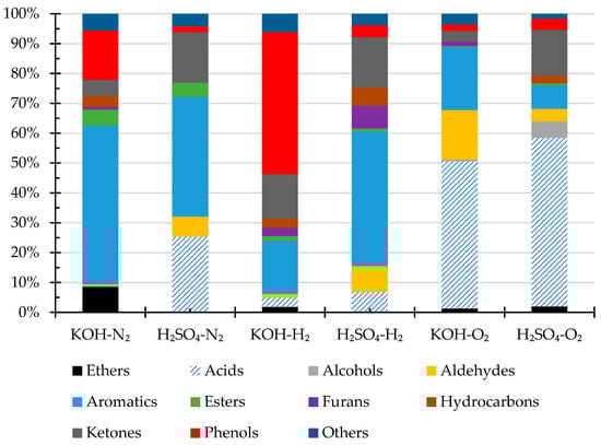 The volatile compounds of the bio-crude oils were analyzed by GC-MS. The results are shown in Figure 2. The identified compounds include carboxylic acids, alcohols, aldehydes, aromatics, esters, ethers, hydrocarbons, ketones, nitrogenous compounds, and phenols. The main volatile compounds in the oils obtained under N2 or H2 atmosphere with KOH catalysts are phenols and aromatic compounds, and the oils obtained under H2 atmosphere contain more phenols than those obtained under N2 atmosphere, likely owing to the reductive depolymerization of lignin [40,45]. In comparison to oils obtained under N2 or H2 atmosphere with KOH catalyst, the biocrudes obtained with H2SO4 catalyst contain much more carboxylic acids and ketones, suggesting acid-catalyzed degradation of cellulose and hemicellulose structures [46].