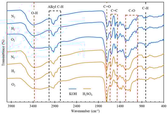 FT-IR spectra of biocrude products from HTL of pinewood sawdust at 300 °C for 60 min under N2, H2, and O2, respectively, with KOH or H2SO4 catalyst.