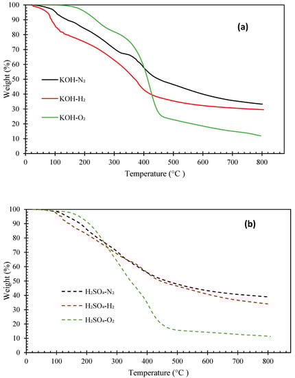 TG curves of biocrude products from HTL of pinewood sawdust at 300 °C for 60 min under N2, H2, and O2, with KOH (a) or H2SO4 (b) catalyst.