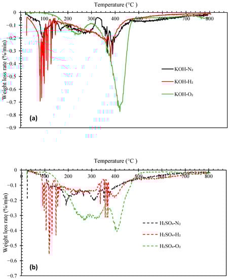 DTG curves of biocrude products from HTL of pinewood sawdust at 300 °C for 60 min under N2, H2, and O2, with KOH (a) or H2SO4 (b) catalyst.