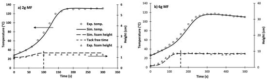 A 0.2, 0.5, 1, and 2 g loading of water was used as a blowing agent, as shown in Figure 4. The 0.2 loading showed that foam height was lower than the predicted value from the simulation code. This was attributed to the low amount of water that generated a low amount of carbon dioxide, which entrapped the resin matrix. The 0.5 and 1 g loading showed good agreement with the simulation and produced good foams. The loading of 2 g also showed lower foam height compared to the simulation. This was attributed to the high amount of blowing agent generated at the initial reaction time before enough polymer formed to hold the gas in the cell. The foam showed bubbles on the top surface and showed bubbles escaping during the reaction. The water performance limits were in the region above 95%. Increasing the water loading led to increased carbon dioxide gas, which escaped from the surface and led to density failure of the foam.