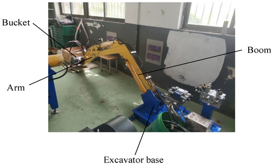 Figure 1 illustrates the structure of the single-bucket excavator test platform, encompassing the boom, arm, bucket, and base. Anchor bolts secured the base to the ground, and a hydraulic control valve group was positioned on the base platform. The boom was hinged to the base via the pin shaft; the arm was connected with the boom through the pin shaft; the bucket was attached to the arm through the pin shaft. A displacement sensor was installed on the hydraulic actuator of the excavator to detect its displacement. Real-time dynamic adjustment was conducted in accordance with the target displacement and the detected displacement, thus accomplishing the displacement closed-loop control of the excavator’s hydraulic actuator.