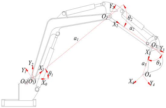 The boom of the single-bucket excavator test platform resembled a three degree of freedom linkage mechanism based on the D-H parameter coordinate method. The origin of the base coordinate system for the test platform was the hinge point between the base and the boom, and the corresponding coordinate system for each joint was established sequentially, with the Z-axis representing collinearity with the joint axis. Figure 2 exhibits the coordinate system for each joint.
