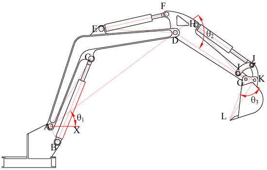 The hydraulic actuators of the single-bucket excavator test platform comprised a boom cylinder, arm cylinder, and bucket cylinder. The angle variables of each joint established a mapping relationship via the geometric model of the excavator and the telescopic displacement of the hydraulic cylinder. By analyzing the geometric dimensions of the excavator, the mapping relationship between the drive space and the joint space was devised, and the displacement parameters were converted into the joint angle parameters to accomplish the trajectory planning for the excavator. Figure 3 unveils the geometric dimensions of the excavator’s arm.