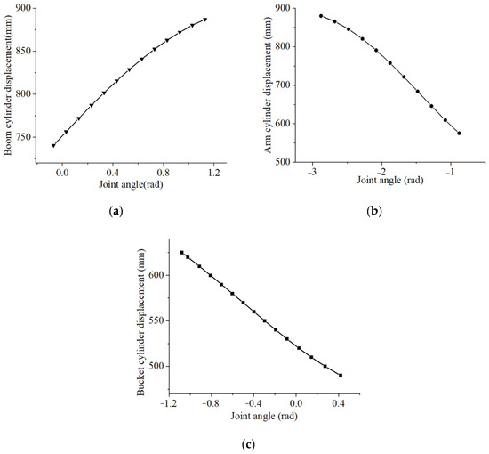 Figure 4 shows that the displacement of the boom cylinder continuously increases when the joint angle between the excavator base and the boom increases continuously; When the joint angle between the boom and the arm decreases, the displacement of the arm cylinder increases; When the joint angle between the arm and the bucket decreases, the displacement of the bucket cylinder increases.