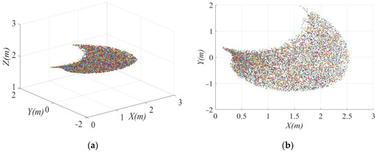 Figure 5 show a similar working space at the end of the bucket of the single-bucket excavator test platform to the half-moon shape. The shape of the bucket end on the X-Y working plane reveals that the maximum excavation height of the single-bucket excavator test platform is 1.8 m, the maximum excavation radius is 2.7 m, and the maximum excavation depth is 1.3 m. The working space parameters of the excavator are consistent with the given mining parameters, hence confirming the reliability of the kinematics model.