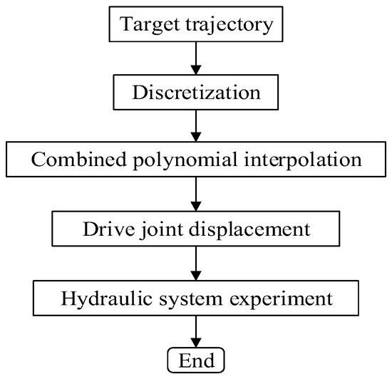 The appropriate step size was selected to discretize the operation trajectory, and the pose sequence of the bucket end in Cartesian coordinate space was obtained when any operation trajectory was supplied at the end of the bucket; The angle variables of each joint in the joint space were ascertained using the inverse kinematics of the excavator, and the combined polynomial interpolation technique sought to plan the trajectory of each joint angle parameter. The joint angle function of the optimal combination interpolation was converted into the displacement sequence of each hydraulic cylinder of the excavator. The experimental platform for the excavator hydraulic system was established to control the displacement of each cylinder in a closed loop (Figure 6).