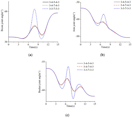 Joint angle curves by three different higher-order mixed polynomials: (a) boom, (b) arm, and (c) bucket.