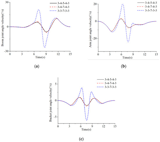 Joint angular velocity curves by three different higher-order mixed polynomials: (a) boom, (b) arm, and (c) bucket.