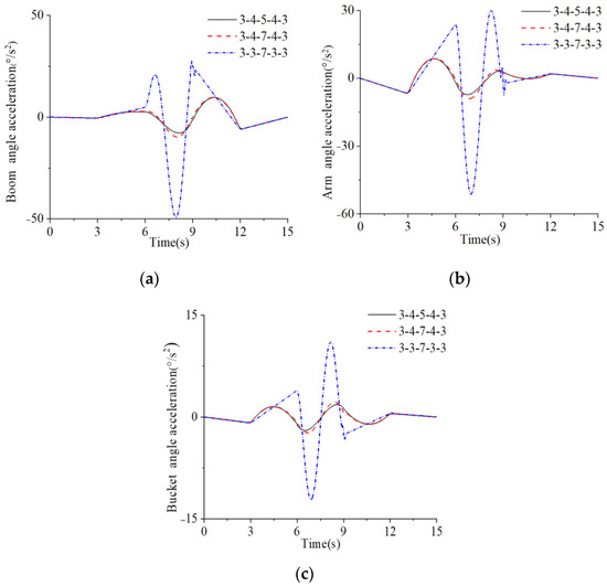 Joint angular acceleration curves by three different higher-order mixed polynomials: (a) boom, (b) arm, and (c) bucket.