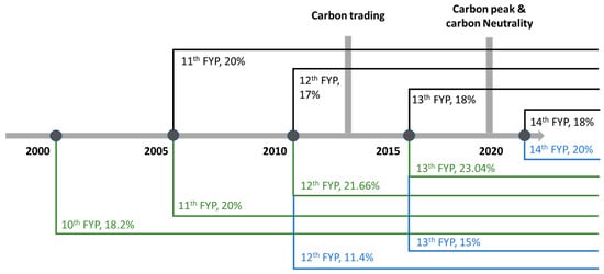 To fulfill international obligations and mitigate climate risk, a series of related activities and policies have been launched before the “carbon peak and carbon neutrality” statement [6]. Some of these policies were implemented to constrain carbon emissions from various aspects. For example, the Five-Year Plans (FYPs) stipulated the increasing target of energy intensity from the 2000s [10] and the decreasing target of fossil fuels from the 2010s [11]. Policies focusing specifically on emission reductions have also been introduced, such as Nationally Appropriate Mitigation Actions (NAMAs) in 2009 [12] and China’s Intended Nationally Determined Contributions (INDCs) in 2015 [13]. FYPs were also introduced, focusing on the development of terrestrial carbon sinks and the increase in atmospheric carbon absorption since the early 2000s [10]. The aforementioned policies and their outcomes provide crucial necessary a priori knowledge for the designation of carbon neutrality pathways, related laws, and regulations [14].