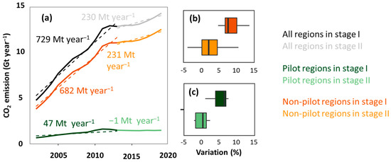 Temporal trend of CO2 emissions in all regions, pilot regions with CETSs, and nonpilot regions. The dashed line in (a) represents the fitted trend. Two colors within the same curve represent two stages (stage I and II). (b,c) represent the distribution of the carbon emission variation rate (%) for pilot and nonpilot regions, respectively.