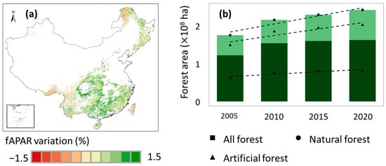 Temporal trend of China’s forest (a) greenness and (b) area. The non-forest in (a) is masked by the MODIS land cover product. The trends of all forests, natural forests, and artificial forests are displayed by different colors and labels.