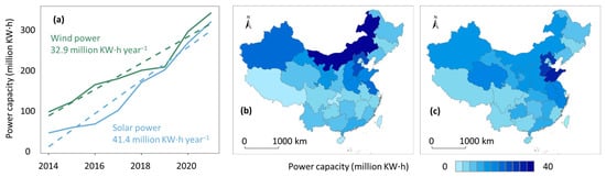 Temporal (a) and spatial trends (b,c) of China’s wind and solar power capacity. Data in (b,c) come from 2021.