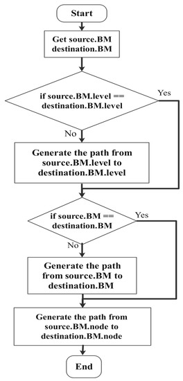 Figure 3 shows the steps followed to apply the MTN topology. The network used source-and-destination pairs as BMs, and it considered the levels of both BMs represented in source destination nodes. It would then choose higher or lower levels based on where each BM node was located. The MTN used an outer BM for moving from one level to another, as shown in Figure 1. Inside the level, it considered whether the BM had the destination node to route the packet to that exact node inside the BM. Routes using shortest-path followed dimensional order routing.
