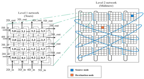 In this section, the architecture of MTNs is illustrated. With regards to our previous paper [31], we only updated the layout of the horizontal links as seen in Figure 1. This difference provides a low diameter and average distances in the network. The main goal of HINs is to achieve a low diameter and average distance values, as described in Section 4. These two properties were not evaluated in our previous paper. Furthermore, this study also evaluated a new modified network to evaluate its static performance and cost effectiveness.