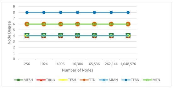 Node degree refers to the maximum number of links exiting a node. Its impact was directly linked to the network cost, where the higher the node degree, the higher the cost due to the router I/O and physical links [40]. In addition, the MPCs considered constant degrees because, when the number of nodes increased, the configuration of the router interfaces would not change. Therefore, the scalability of this network was simple and cost effective. In contrast, our MTN was more computationally demanding. However, it provided high bandwidth availability for low congestion and minimal network latency, both for a reasonable cost increase [41]. As shown in Table 2, the MTN had a moderate node degree, as compared to a high degree in the TFBN and the low values found in conventional networks. In addition, Figure 5, below, is used to show the time complexity of various networks compared to MTNs when the network size increases.
