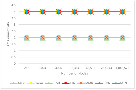 This was the minimum number of links required to divide the network into two separate parts. It was a critical value, as it indicated the fault tolerance of the network. The fault tolerance had to be prepared in advance due to the high frequency of faults [44]. Therefore, a high value in arc connectivity indicated a more robust network. The static fault tolerance of the HIN was identified by the ratio between the arc connectivity and the node degree [45]. The BMs of the MTN provided the maximum fault tolerance that a network could have due to the equality between the node degree and the arc connectivity. In addition, the arc connectivity indicated the alternative paths that could be taken in the event of a failure. The MTN had optimal arc connectivity, similar to most of the other networks. However, the BM had a maximum fault tolerance that enabled robust implementation of the underlying architecture. In addition, Figure 6, below, shows the arc connectivity of various networks compared to MTN when the network size increases.