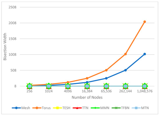 Bisection width was the minimum number of links required to ensure two equal halves of the network. In a parallel processing environment, this was vital due to the regular use of a divide-and-conquer approach, where the network is divided into two halves that are then each divided further to enable the network to perform multiple tasks simultaneously. If the value of the bisection width was low, this resulted in a lower bandwidth used to merge the two halves, leading to more congestion in the packet flow. However, a large value could not be viable without a significant increase in wiring, resulting in a more costly and complex implementation [46]. Therefore, moderate values were ideal for parallel processing, which was demonstrated in the MTN, as compared to conventional networks that were more complex and expensive. Also, Figure 7, below, shows the bisection width of the MTN in comparison with other networks as the network size increases.