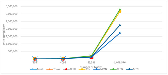 Wire complexity refers to the total number of wires required to implement the network topology. It depended on the node degree, since it identified the wires exiting a node. Although wire complexity was not an actual cost of the network configuration due to physical routers and the length and wire types used, it provided a reliable indicator of resource demand. The greater the number of wires that were needed, the more cost was required for physical resources. However, costs could be justified according to their contributions to low latency and high fault tolerance, and even lower the costs of the overall network, that is, they could elicit a better performance in terms of the connectivity between nodes and hierarchal levels. The MTN had better performance on this parameter, as compared to the TFBN, due to having lower wire complexity for physical links, improving its scalability and affordability. Finally, Figure 8, below, is used to show the wire complexity of various networks in comparison with MTN when the network size increases.
