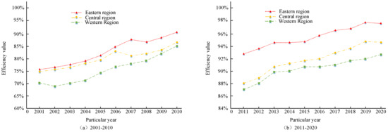 Efficiency values of GTFP in the eastern and western regions from 2001 to 2020.