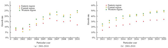 Table 6 indicates that the contribution of environmental factors was different in the three different regions of China. The growth effect of environmental factors on economic growth was basically negative in all three regions, that is, the input of environmental factors hindered RE growth. Furthermore, it was also found that the growth effects of environmental factors in each region were very consistent with the actual economic situation. The above results indicate that the model of using energy consumption and CO2 emissions as input factors to drive economic development was gradually going downhill. Therefore, the country needs to introduce corresponding policies to change the economic growth mode from sloppy to efficient. In spite of the hindering effect of the environment on economic growth, China’s economy is still at a high growth rate. It indicates that the GTFP growth rate is growing faster to compensate for the hindering effect of the environment and promote high economic development. To account for the GTFP growth rate of each region, the expression of the output factor elasticity was substituted into Equation (10) to obtain the GTFP growth rate of each region in each year. Figure 4 displays the specific results.