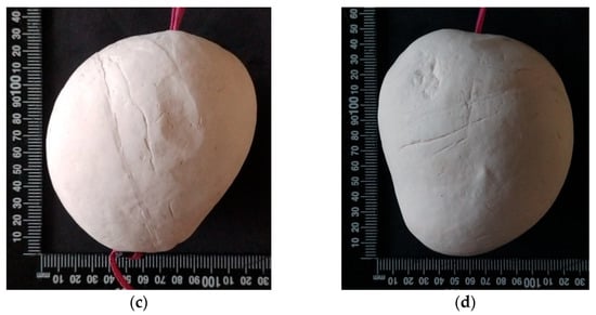- Several designs were based on use of flexible fingers (20 mm height, 100 mm length) employing the FinRay™ effect as described in [41]. A three-fingered arrangement, as used by Chen et al. [15] for apple harvesting, was trialled but discontinued (and not documented here) as it failed to cope with variation in mango fruit size. Four- and six-finger arrangements were trialled, either in two parallel arrays of two and three fingers, respectively, or with the top and bottom fingers tilted (Figure 1d–g). These designs were coded in terms of finger number, top and bottom finger angles, and palm height and width; for example, 6F_30A_100H_100W describes an end effector with six fingers, 30° angle on top and bottom fingers, and a 100 mm × 100 mm base plate.